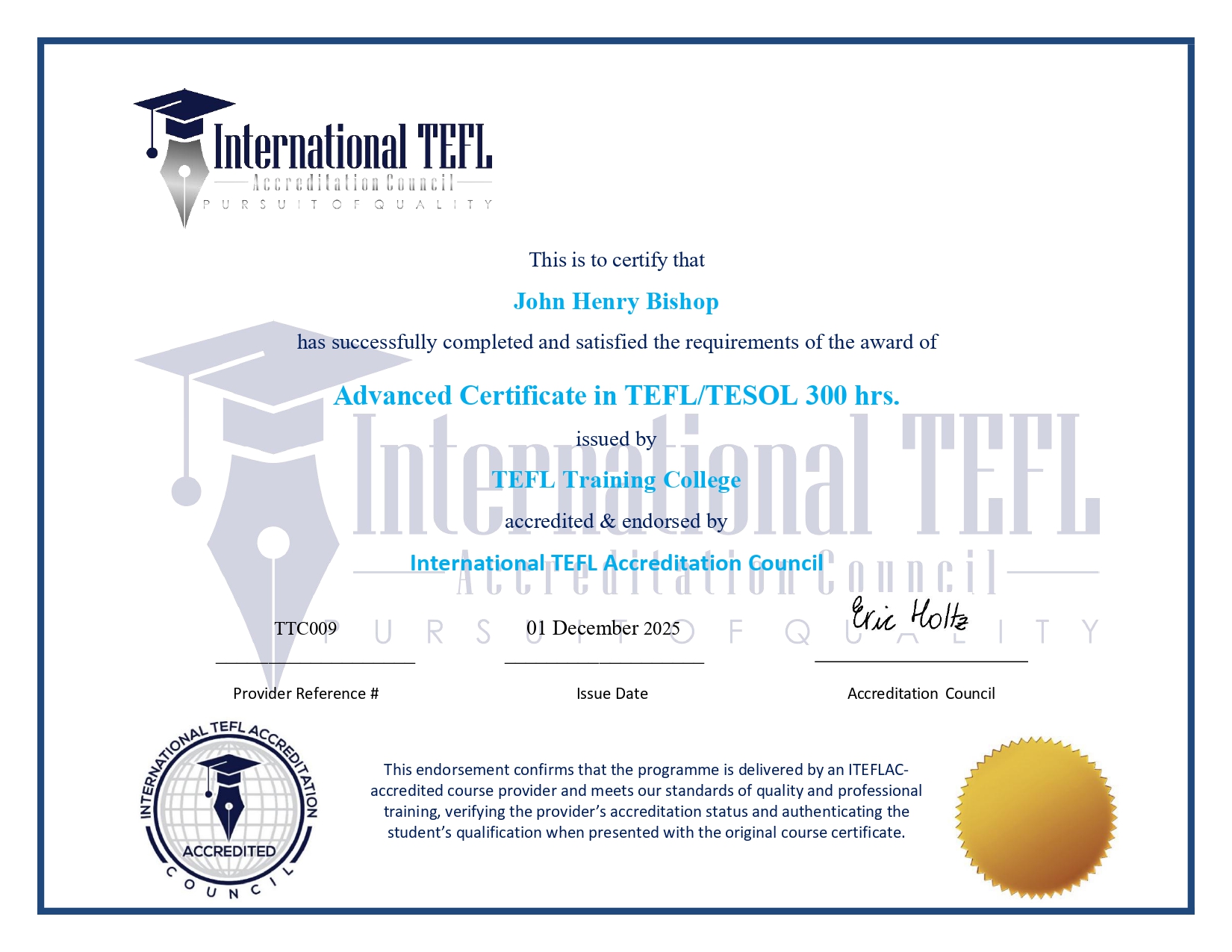 For those seeking an official and accredited TEFL qualification, you have the option to order a digital certificate below. These certificates are internationally accredited by the International TEFL Accreditation Council (ITEFLAC), each bearing the ITEFLAC logo, a unique reference number for verification, and an authorized signature.
