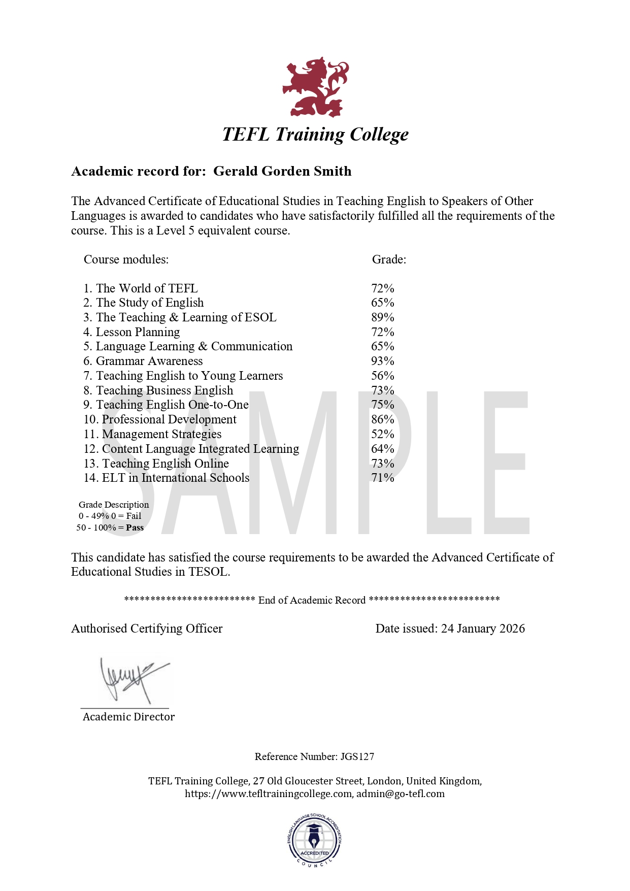 *You can add your academic record / transcript when ordering your official accredited TEFL/TESOL Certificate. The fee for the academic record / transcript is £9.